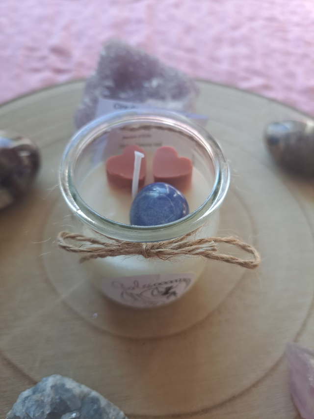Bougie avec collier en acier inoxydable et pierre roulée aventurine bleue